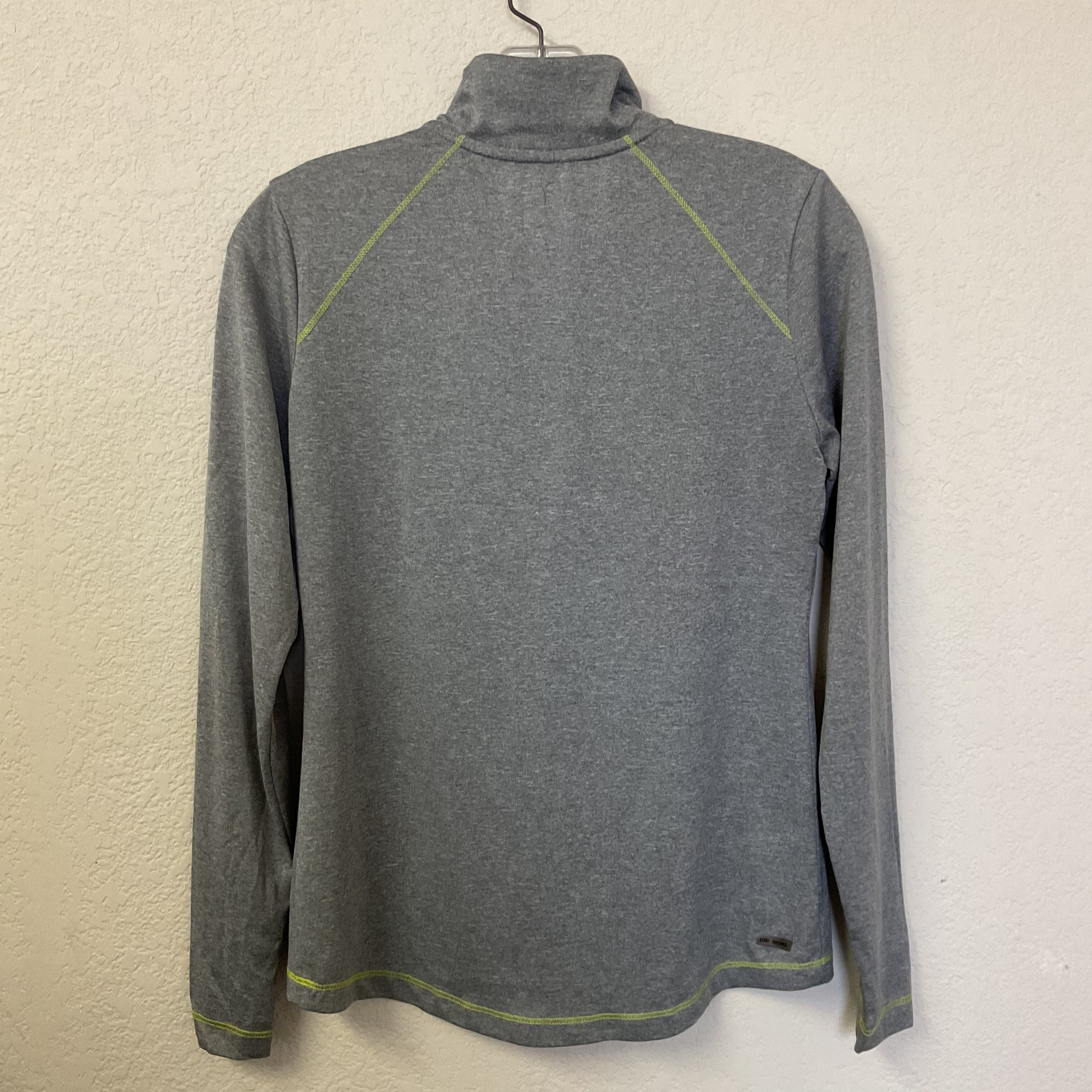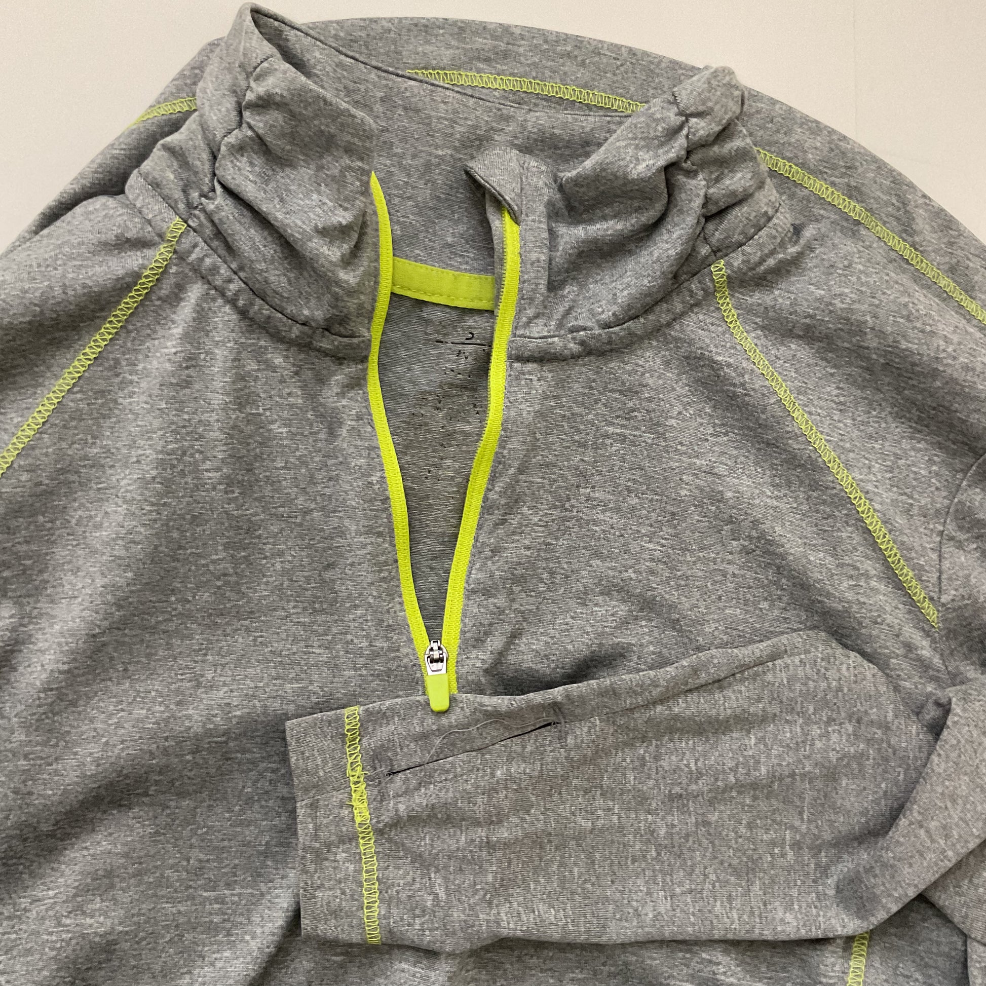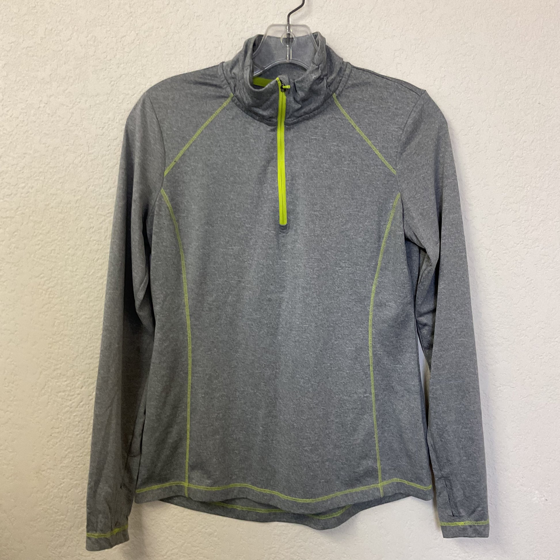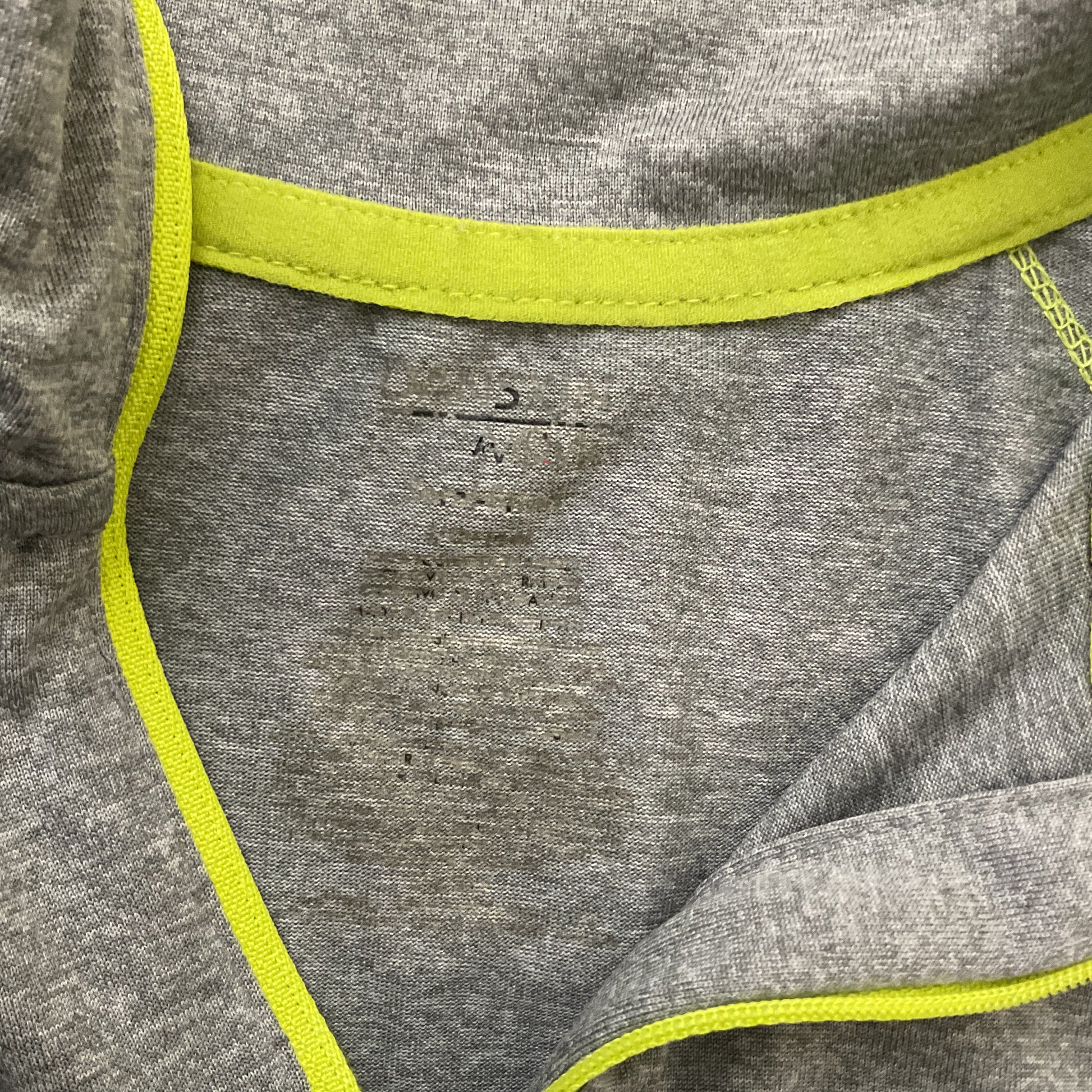 Danskin Dry & More Sports Women’s Top Size M. Grey and lime green pullover sport top. Dri fit, polyester. Measure are neck 7 in, zipper 8 in, shoulder 4 1/2 in, pit 8 in, chest 18 in, length 23 in.(7359).