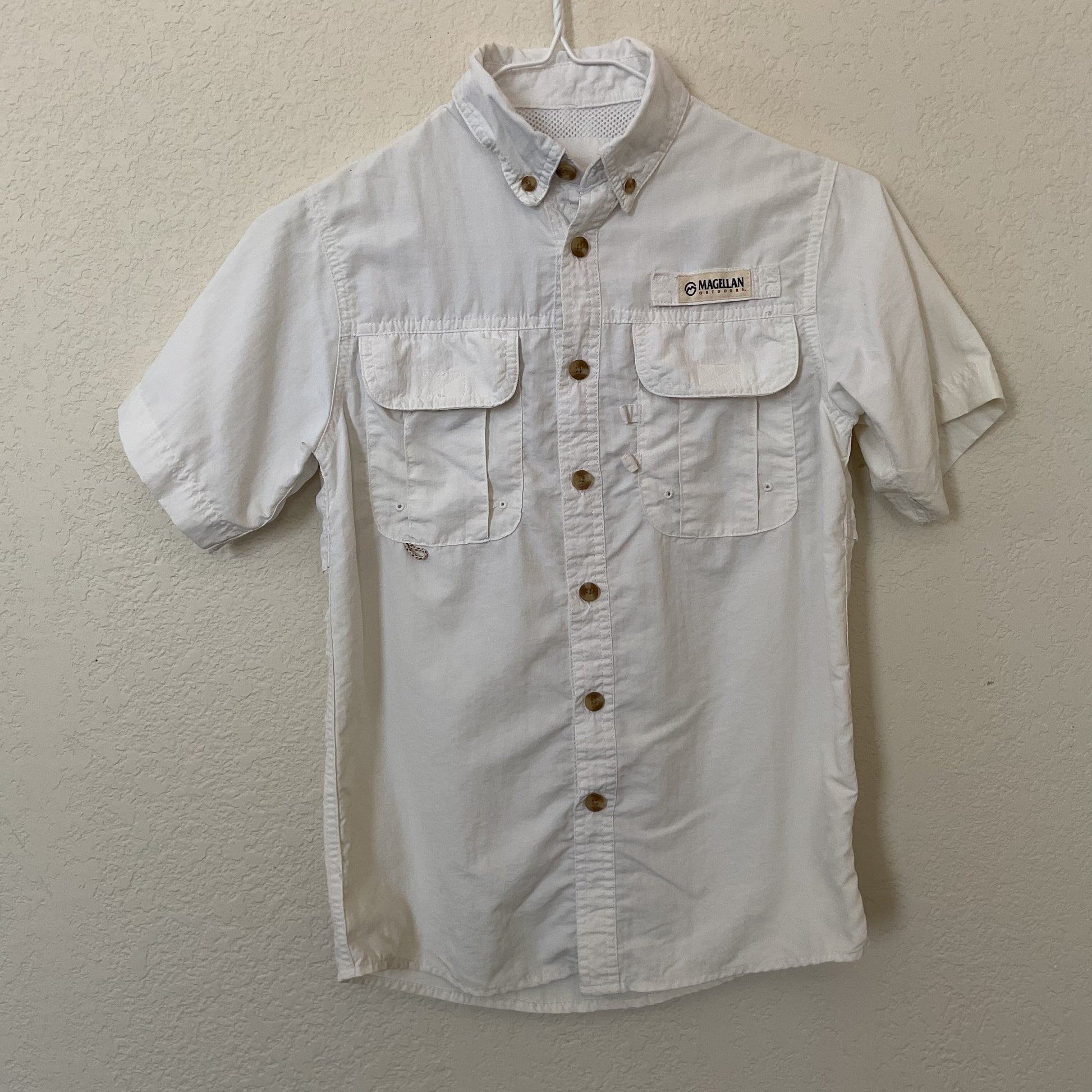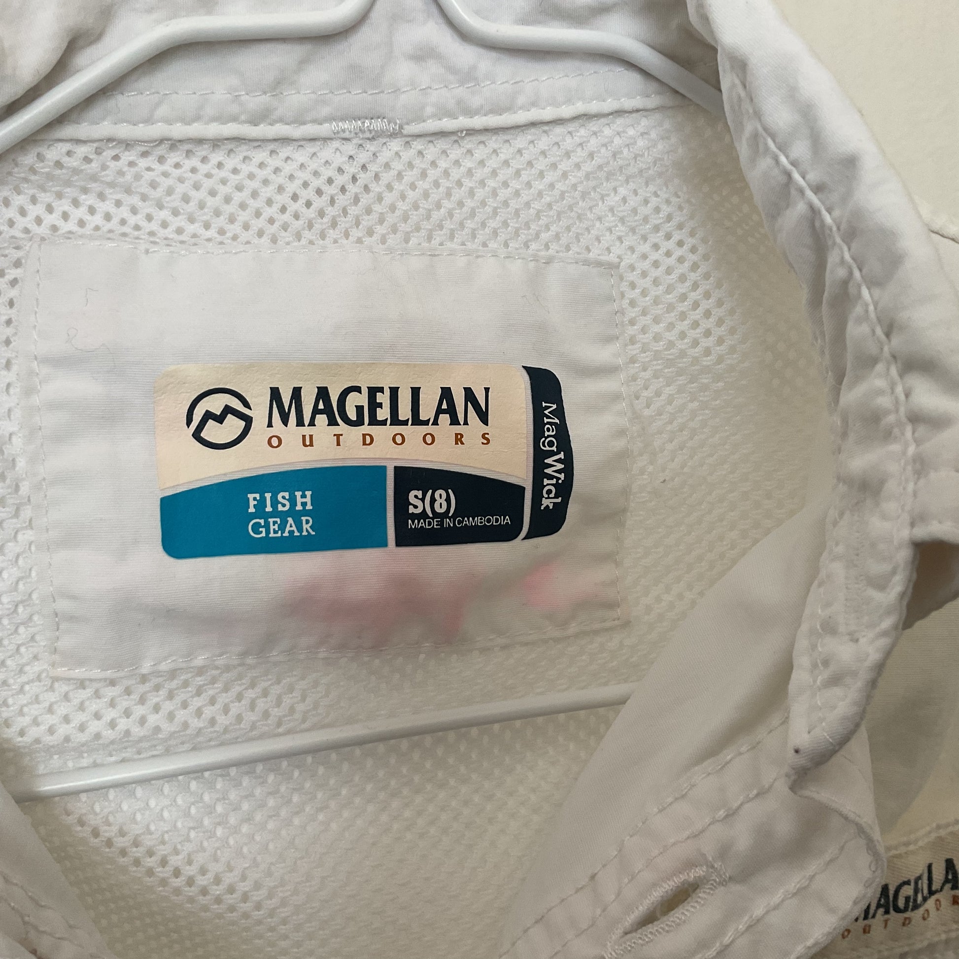 Magellan Outdoors Fish Gear Boys Shirt Size 8. Washed white mag wick short sleeve boys shirt. Please note inside discoloration . Measurements are neck 5 in, shoulder 4 in, pit 7 in, sleeve 7 in, chest 17 in length 23 in. (4335).