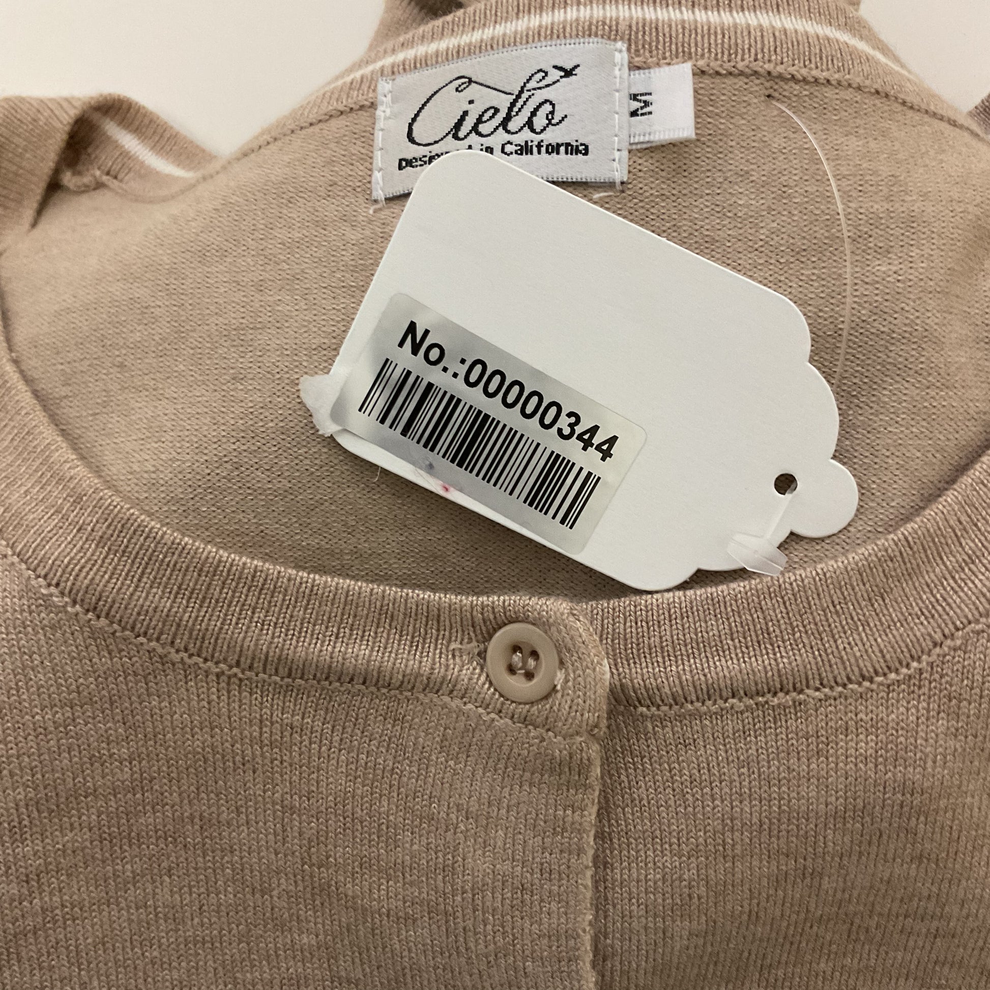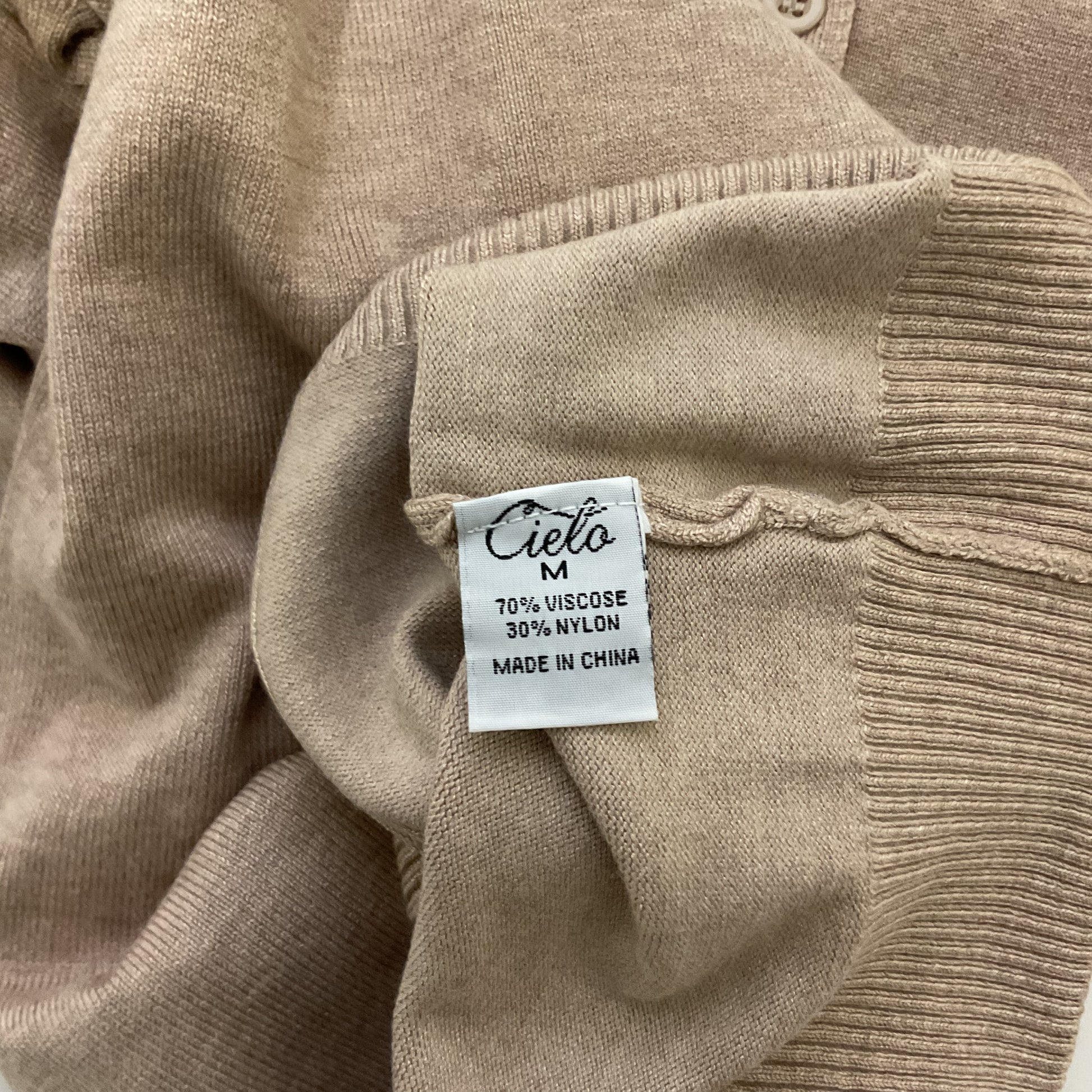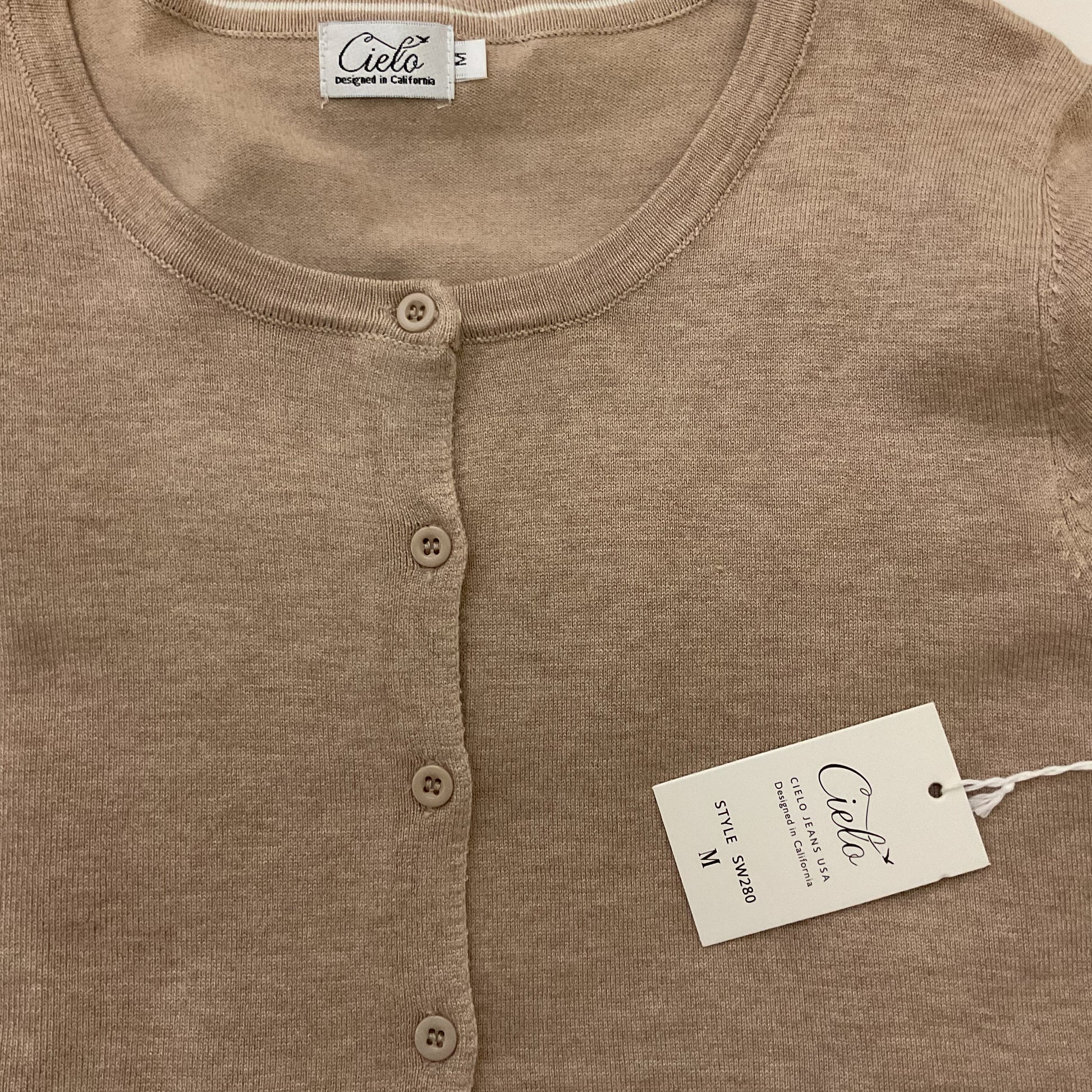 NWT Cielo Design In California Women’s Cardigan Size M. Basic beige all combinations, measurements are neck 8 in, shoulder 3 1/2 in, pit 9 in, length 25 in. (0344).