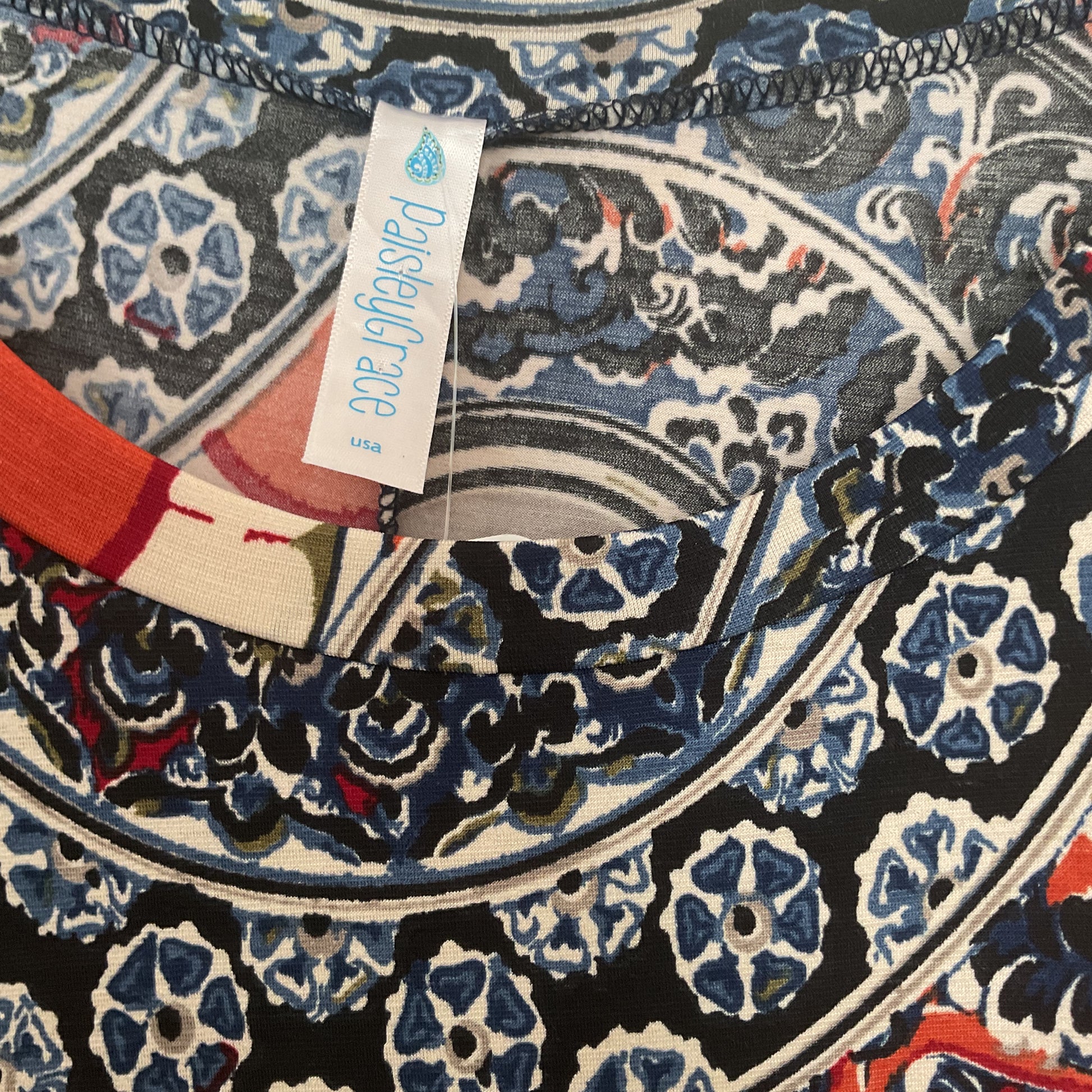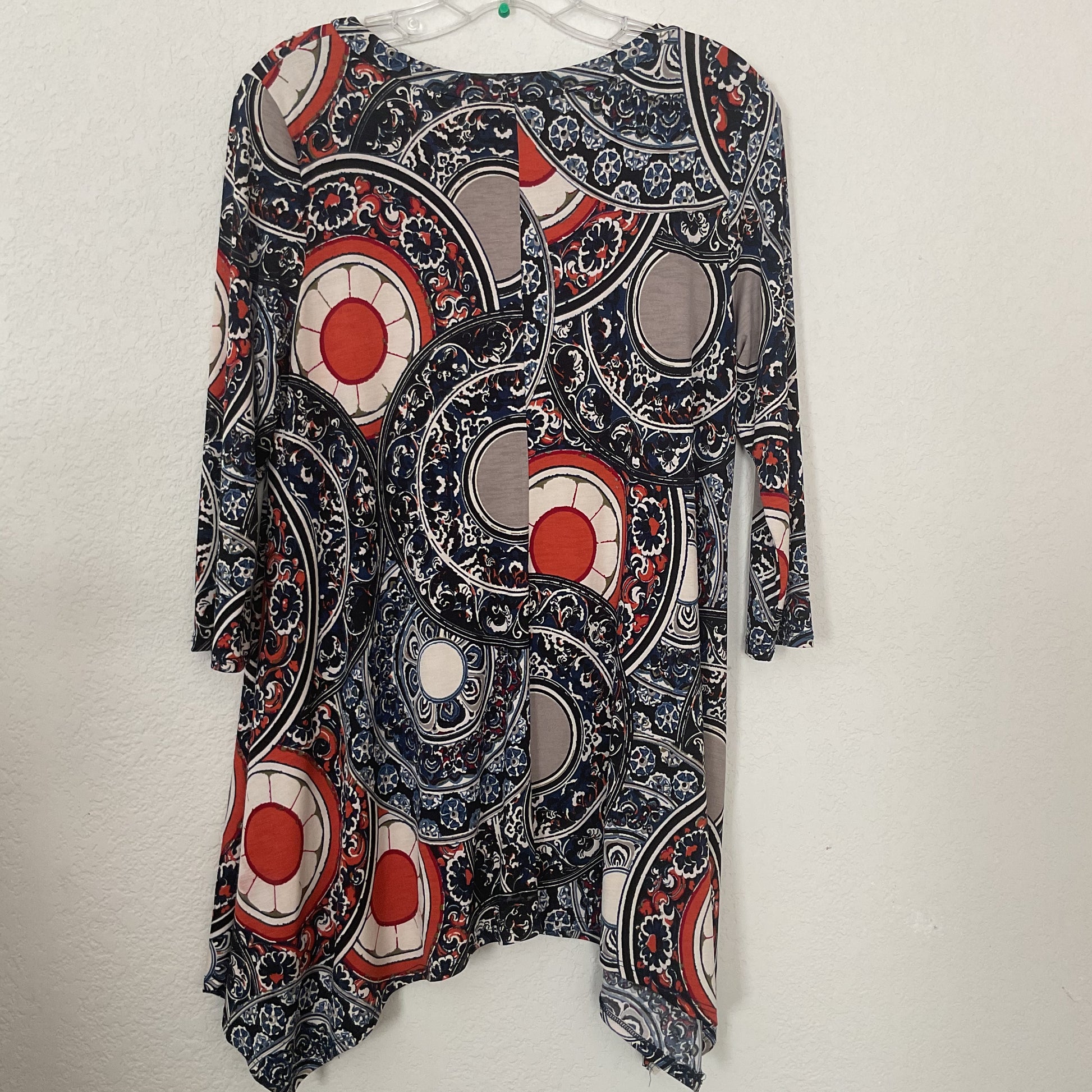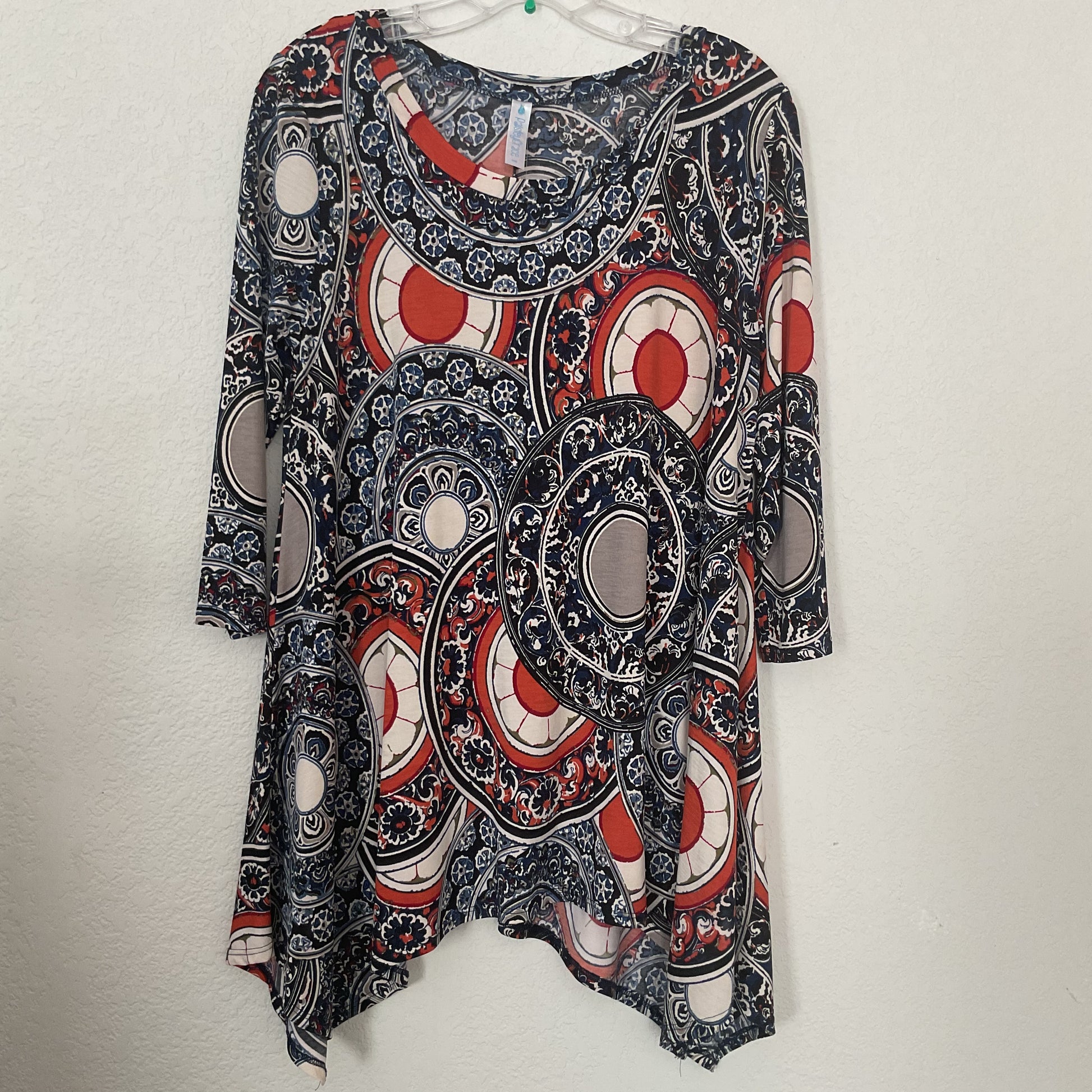 Parsley Grace Bright Colors Women’s Easy Wear Blouson Size S. Bright oranges, v cut seams, 3/4 sleeves. Measurements are neck9 in, shoulder 3 in, pit 20 in, chest 20 in, length 32 in longest. Polyester. (5039).