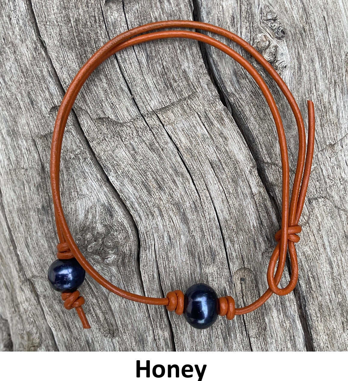 Single Black Pearl Necklace, #22 Honey Leather Cord