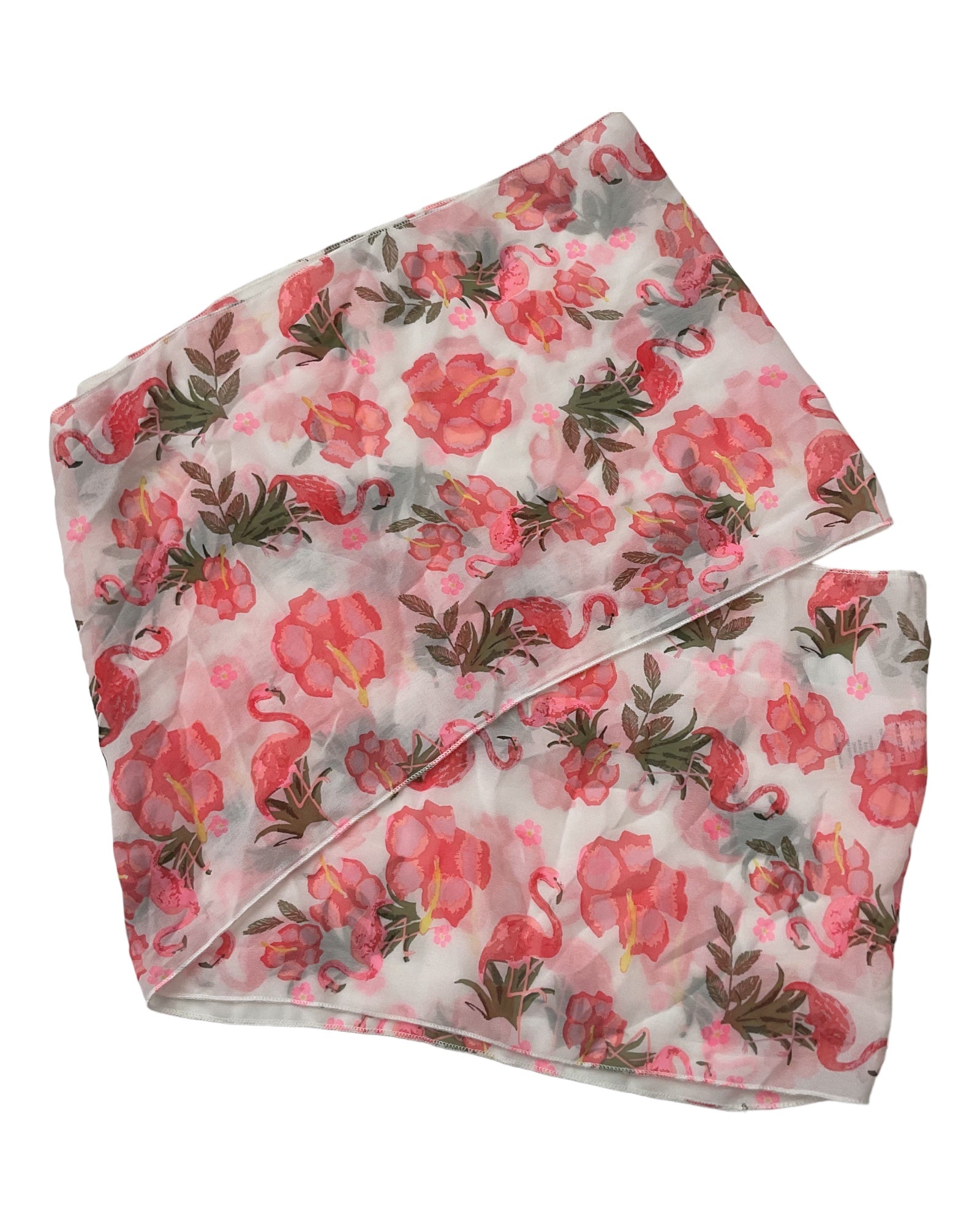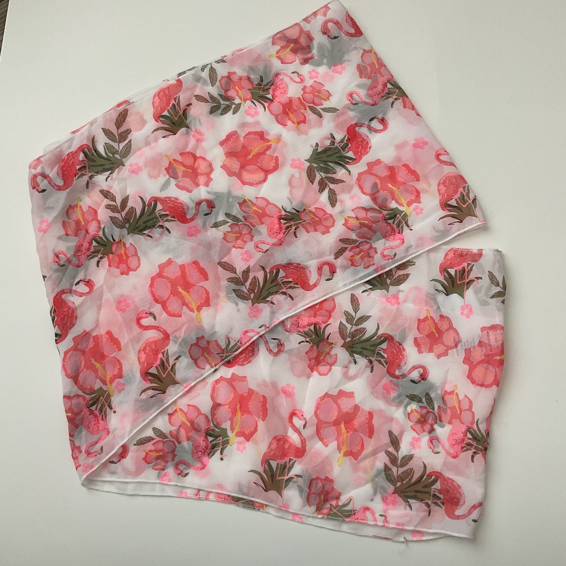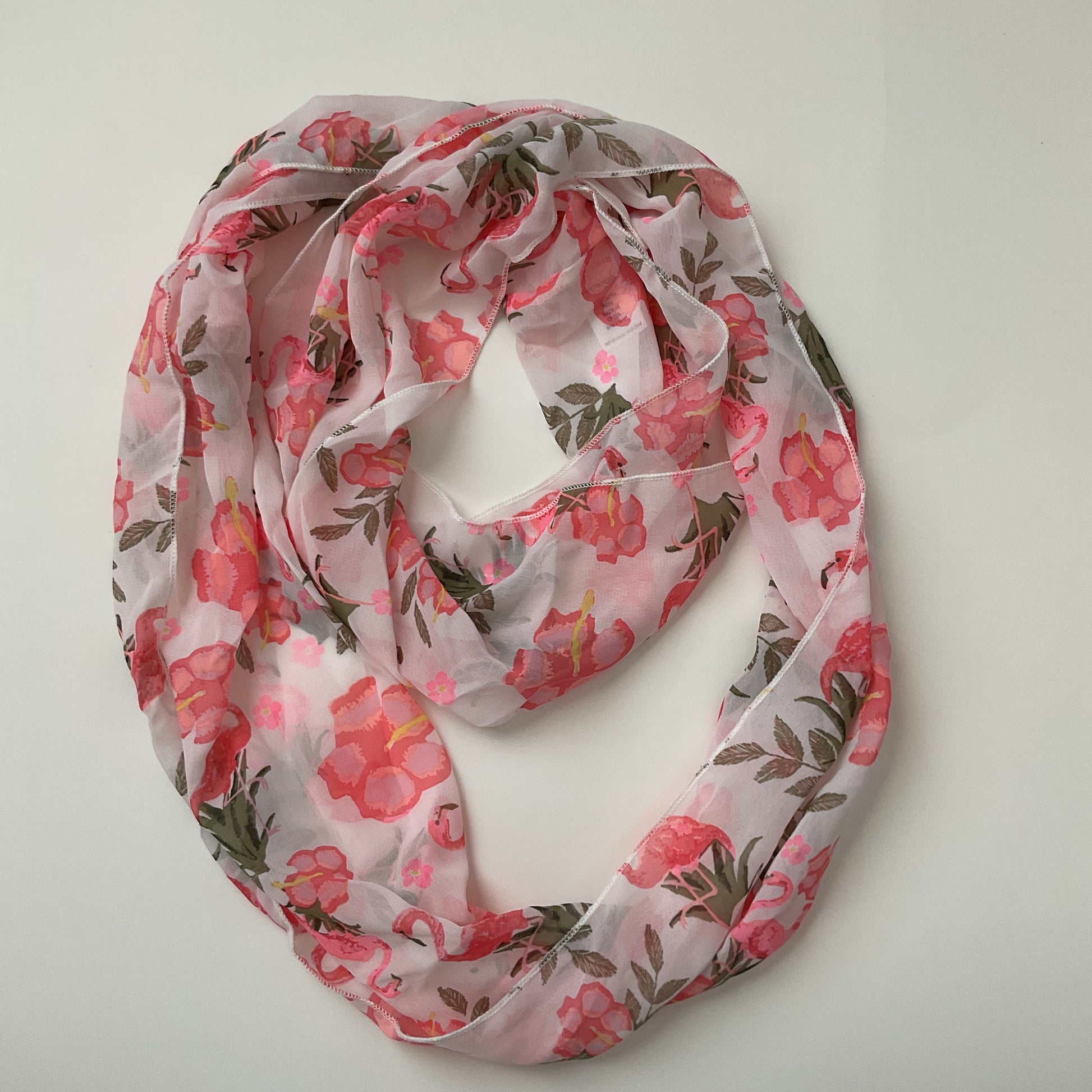 Tulips & Flamingos Summer Infinity Scarf. Pink white and greens scarf, measures are wide 10 in, length 30 in. (7295)