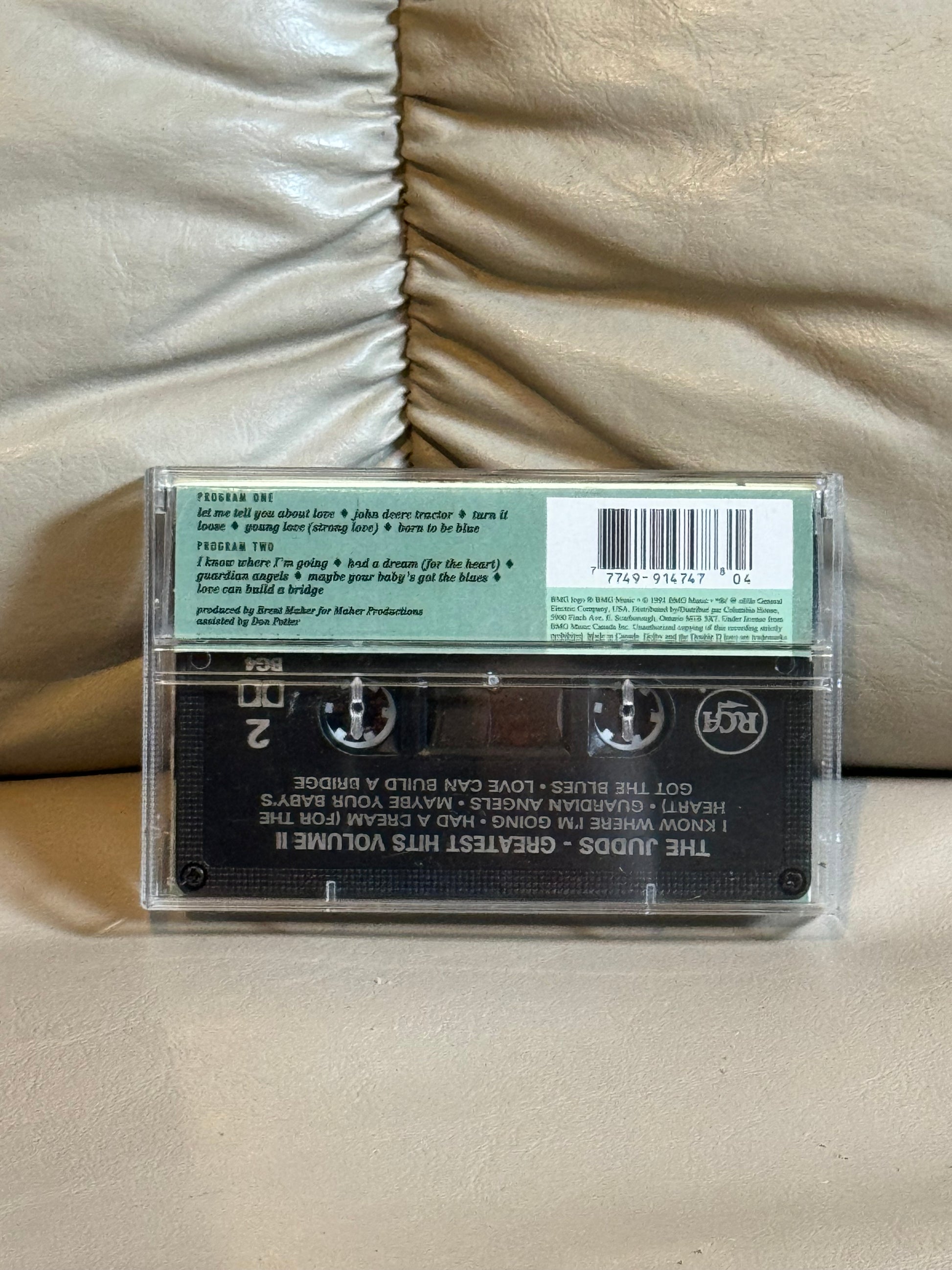 The Judds' Greatest Hits Volume Two cassette is a must-have for all country music lovers. This first edition compilation features the legendary duo's best hits, including some in Spanish language. The cassette comes in a standard jewel case and is in very good condition, both in terms of the case and inlay.(7458)